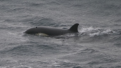 Monday 18 October. The promised southeast wind had arrived, but at 25mph or more was stronger than forecast and made birding difficult. We walked down to Norwick Bay seeing just 2 Long-tailed Duck off the beach and a Chiffchaff in a ditch. Walking up to Valyie it was clear there had been a big arrival of Redwings with an estimated 3500 in the area (all Redwings seen well today appeared to be Scandinavian origin). With them we saw a Ring Ouzel and at least 10 Fieldfares. About 70 Bramblings were feeding in the weedy fields but we couldn’t find anything else, with no sign of any redpolls there or in Norwick. After a refreshment break we drove to Skaw where about 1500 Redwings were in the fields with another 1000 and a Merlin along the track out to Lamba Ness. We were approaching Saxa Vord on our way to Burrafirth when an Unst Birders WhatsApp message from Robbie Brookes came through to say a pod of Orcas were in Haroldswick Bay. We immediately diverted and 5 minutes later were watching a couple of them heading north out of the far side of the rather narrow bay. They were not up for long but I saw more than a brief fin, my previous best. It seemed likely they would continue to Norwick Bay and/or Lamba Ness. Based on Dave’s experience we were most likely to get the best views from Lamba Ness, provided they didn’t pass submerged as they had the last time. We quickly drove to the end of Lamba Ness where we hedged our bets by scanning south from an old brick lookout. I picked out a distant fin three times in quick succession as they approached around Clibberswick Hill, about 1.5 miles away, but it then seemed an age before Dave saw one heading into Norwick Bay. We and four others who had joined us legged it to the cliff edge where we found some shelter from the wind and had sporadic views as they moved towards the head of the bay before turning back along the south side of Lamba Ness towards us. Never in view for long, I saw breaching twice and Dave saw and photographed spyhopping. They picked up speed as they passed below us and from then on it was hard to keep up with them as they submerged and headed out towards the Holm of Skaw. What an amazing experience and one I feared I'd missed my chance of on this visit with two half-fins momentarily off Lamba Ness one day and an ultra-brief whole fin and maybe a bit of body on another. The weather soon deteriorated and we drove around looking for thrush flocks we could view from the car. We saw 750 Redwings, 20 Blackbirds and another 80 or so Bramblings but little else. With the rain intensifying and visibility worsening we called it a day and were back home by 16:30, in time for Dave to spot a first-winter Glaucous Gull from the kitchen window as it flew around the bay. A very satisfying day despite my lowest daily species total for the visit.