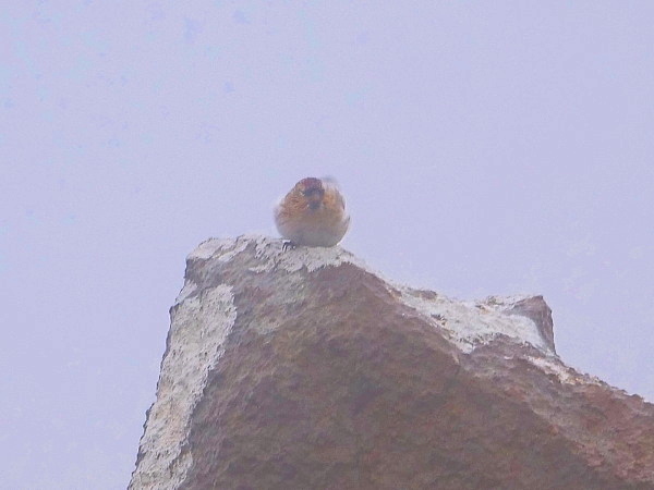 fence maybe 30m away. Before I could raise my binoculars to look at it the Snow Buntings flew off left, I concentrated on them and counted 11 as they disappeared into the murk. Looking back at the fence the other bird was still there. Fully